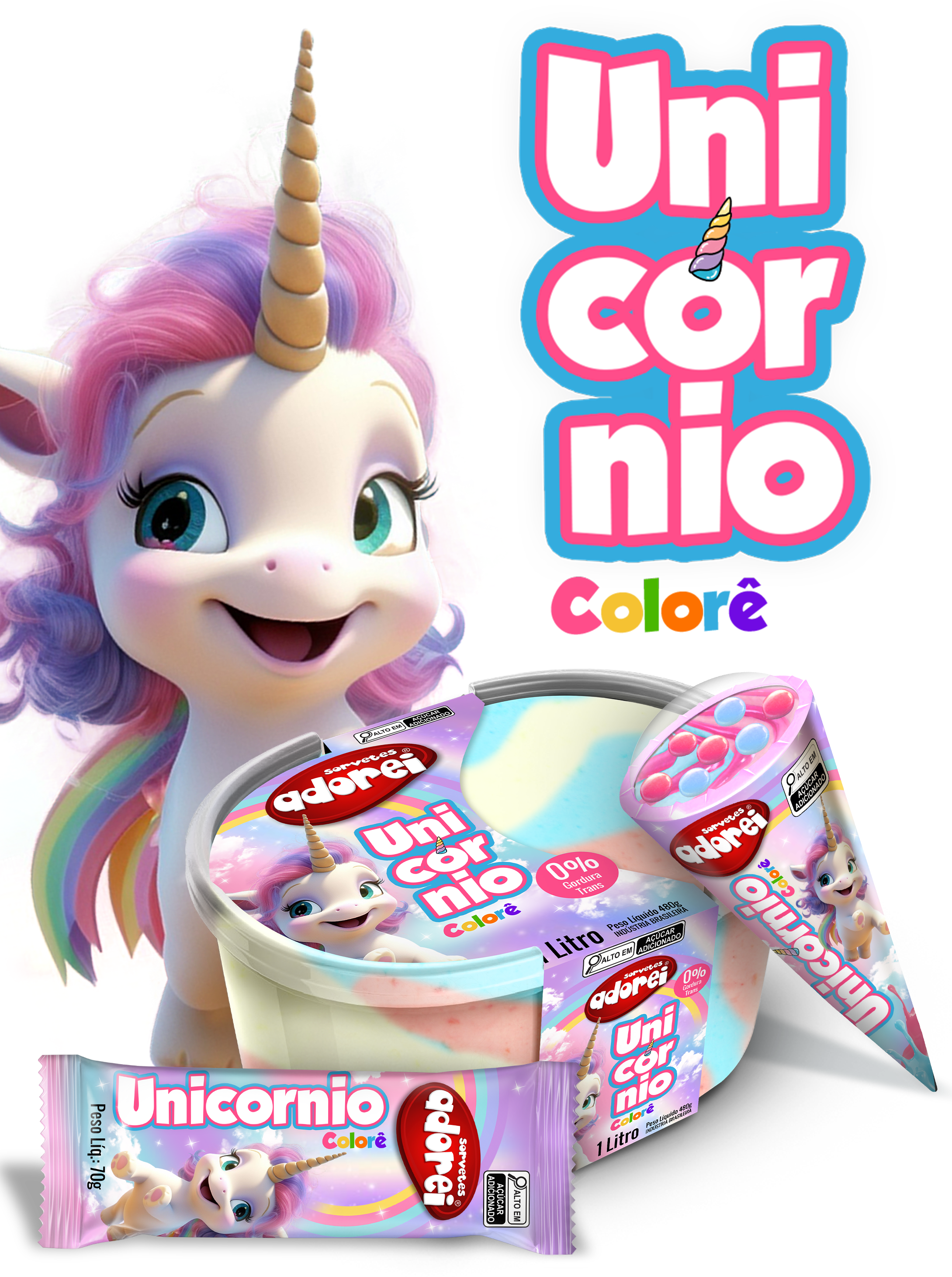 The daughter of the owner of the company is in love with Unicorns, and not just her, but it is a topic that has become increasingly popular in the media, and ice cream of course could not be left out, and so her father, owner of Sorvepatri, wanted launch the unicorn flavor at the request of her daughter and so we did and it was a huge success right from the launch. For the new packaging, an art was made for the 1 liter pot and popsicle, the ice cream being a mixture of bubblegum, cream and blue sky flavors and the popsicle in the blue sky flavor, with white chocolate topping with colored chocolate sprinkles. To better illustrate the packaging, we made an exclusive illustration of a very colorful unicorn to draw the attention of the kids, we also used very bright and cheerful colors in the same pattern as the colors of the ice cream and typical elements of the unicorn theme such as rainbow, clouds and stars.